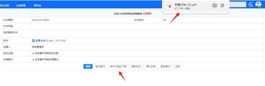 集成附件转换引擎,实现文件的格式转换功能,支持Word文档转PDF格式;用户找到对应文件后,点击“转PDF格式下载”按钮,即可自动将Word文档转换为PDF格式并下载,操作便捷高效。