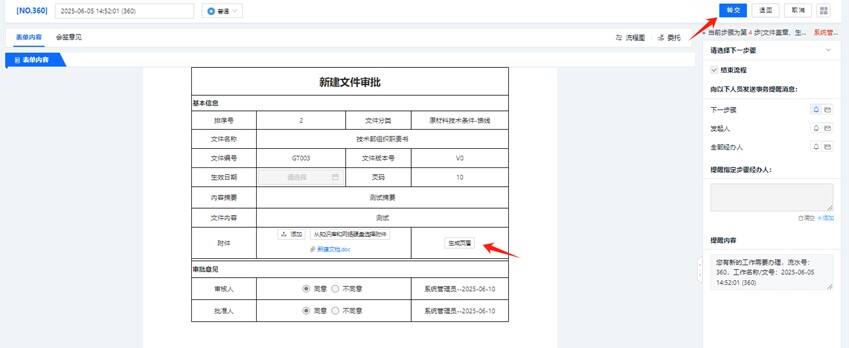 在OA知识库中可直接创建新文件。系统将自动生成文件排序号与唯一编号。发起流程审批后,文件将按预设规则自动生成标准化的页眉、页脚,并完成在线电子盖章,确保所有产出文件格式统一、身份合法。