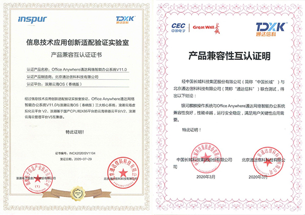 4、适配国产整机产品、各种云服务:通达OA已完成长城、华为泰山、浪潮云海云平台、华为鲲鹏云、华为FusionAccess桌面云等厂商的产品。