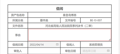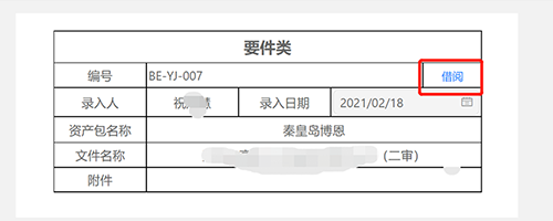 | 资产文件包管理 | 要件类 | 文件创建上传、文件借阅申请 |
