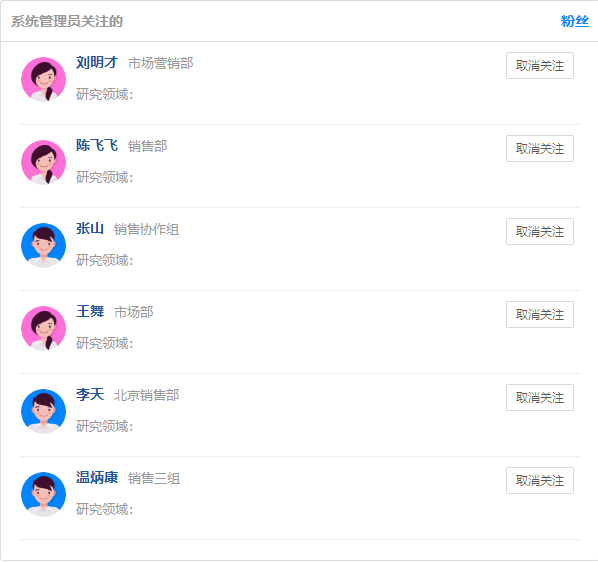 关注员工的方式共有4种:搜索的结果界面进行选择关注、企业社区中推荐关注、用户信息界面关注、动态区域鼠标移到头像处进行关注操作。方式多种多样,实用性强。