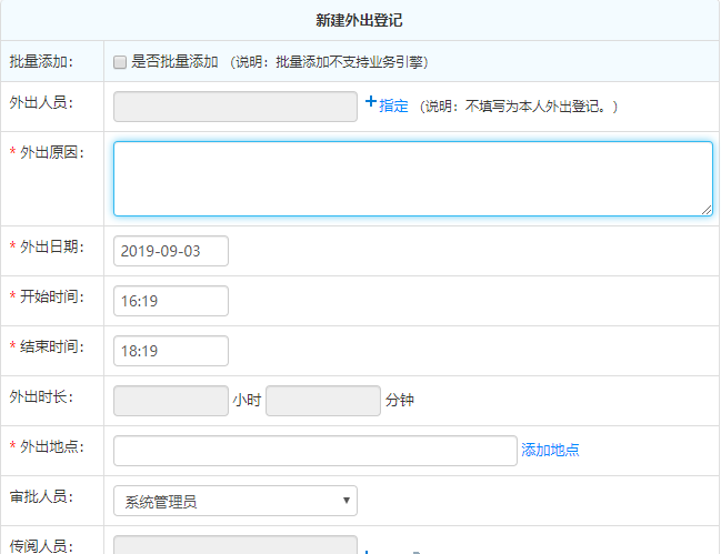 外出登记,需要填写相应申请项目,如下图。申请人填好后点击【申请外出】,“审批人”会收到一条短信息提示。“审批人”执行了“批准”或“不批准”操作之后,申请人会收到一条短信息提示。登记时还可以帮指定人外出登记,也可以批量指定人员外出登记,仅管理员和本部门HR管理员有此权限。