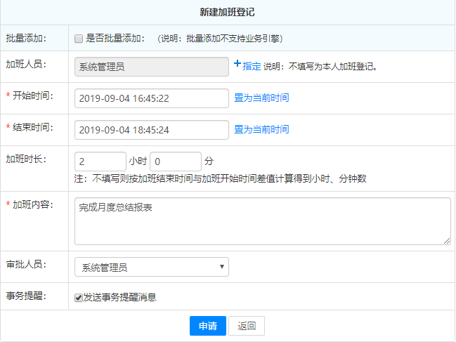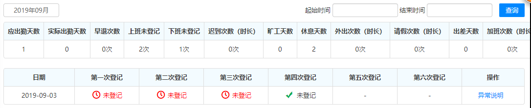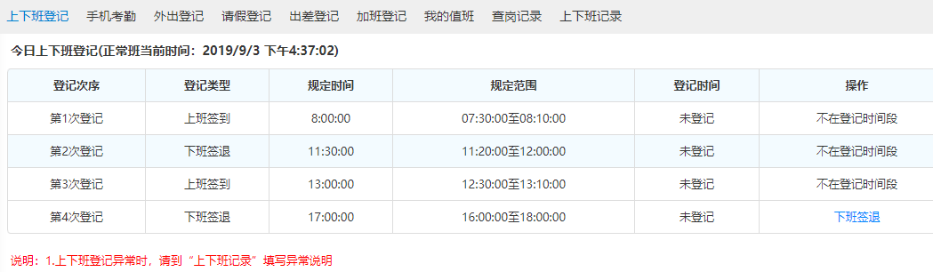 “出差登记”的界面和操作与“请假登记”基本相同。