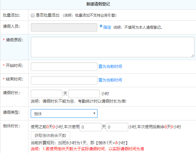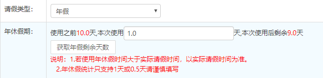 在请假登记界面中通过点击“获取年假剩余天数”可以查看到当前自己还剩下多少天年假,方便用户了解自己的请假情况。