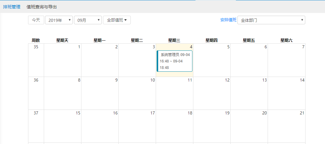 在【人力资源】-【考勤管理】-【值班排班管理】中进行人员排班安排。可以在“我的值班”中以“值班列表视图”和“值班月视图”两种视图查看值班安排。