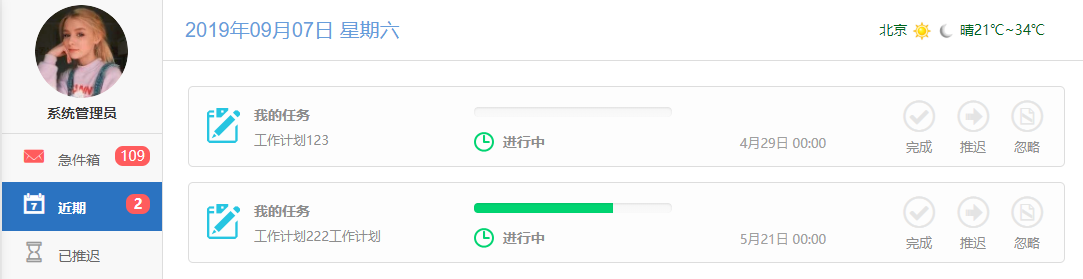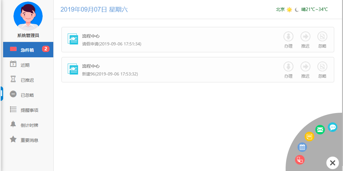 在“急件箱”里,将未办理的过期的日程安排、超时的工作流等数据按时间进行展示,点击日程或流程中心进行办理,并且可以将待办任务推迟或者忽略,推迟可自定义推迟时间进行延后办理,忽略后可将该工作忽略,存放到已忽略任务中显示,从而和其他需办理工作区分开。