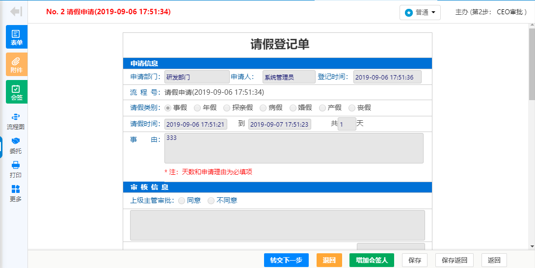 办理任务会打开相应的任务界面(以流程中心举例)。 选择“办理”后,打开了收文单,进行任务的办理。