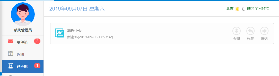 在【已推迟】里,将未来要办理的日程安排、流程中心等数据按时间进行组织和展示,点击日程或流程中心进行办理,并且可以将待办任务恢复或者推迟。