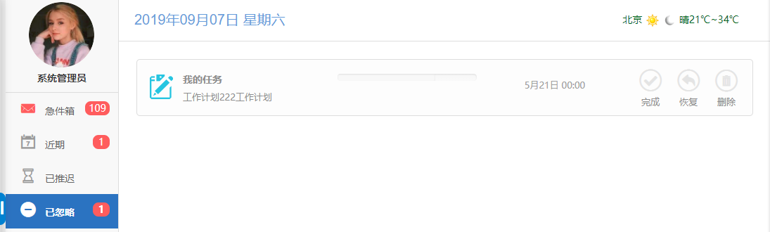 在【已忽略】里,将已忽略的日程安排、流程中心等数据按时间进行展示,在日程安排中,可以选择【完成】、【恢复】或者【删除】;工作流中,可以选择【办理】、【恢复】或【推迟】。