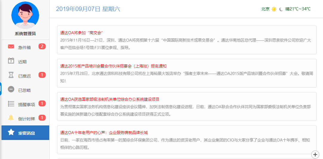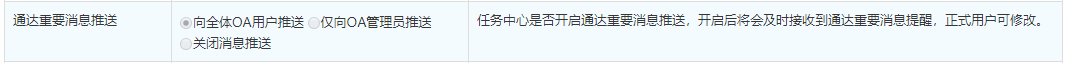 在【菜单】-【系统管理】-【系统参数设置】中,可以对重要消息进行设置。重要消息为通达内部资讯的发布,用户可以设置推送的人群和对消息推送进行关闭,前提是通达的正式用户,否则此选项为不可编辑状态,默认为向全体OA用户推送