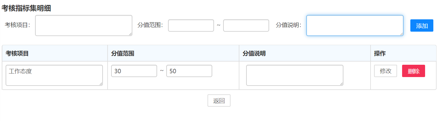 点击【指标集明细】即可进入指标集明细界面,输入考核项目和分值范围,点击【添加】即可新建一项考核指标,考核指标集明细界面。
