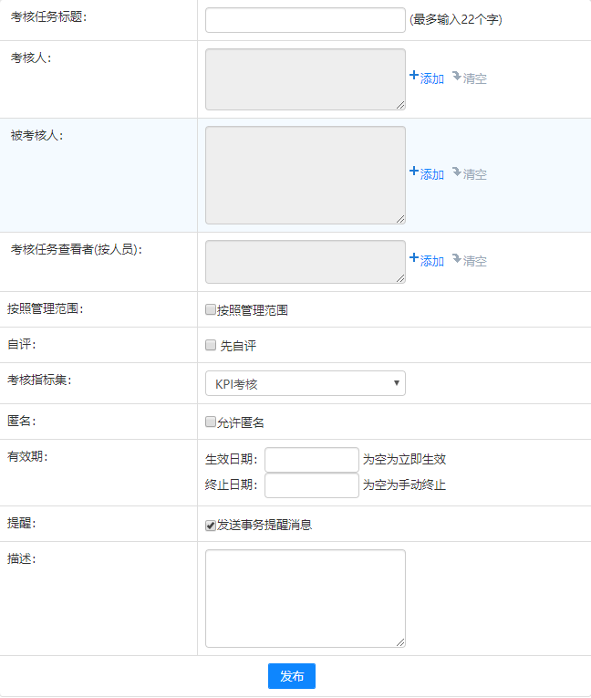 新建考核任务中,按照管理范围:由于考核人和被考核人都是多个,如果选中【按照管理范围】,每个考核人进行考核时只能考核自己管理范围内(在系统管理用户管理中设定)的被考核人。如果不勾选【按照管理范围】,考核人进行考核时就对所有的被考核人进行考核。选取适当的考核指标集,下拉框中会显示上一步所建立的考核指标集。匿名选项是选择在查询考核数据时是否显示考核人名称。