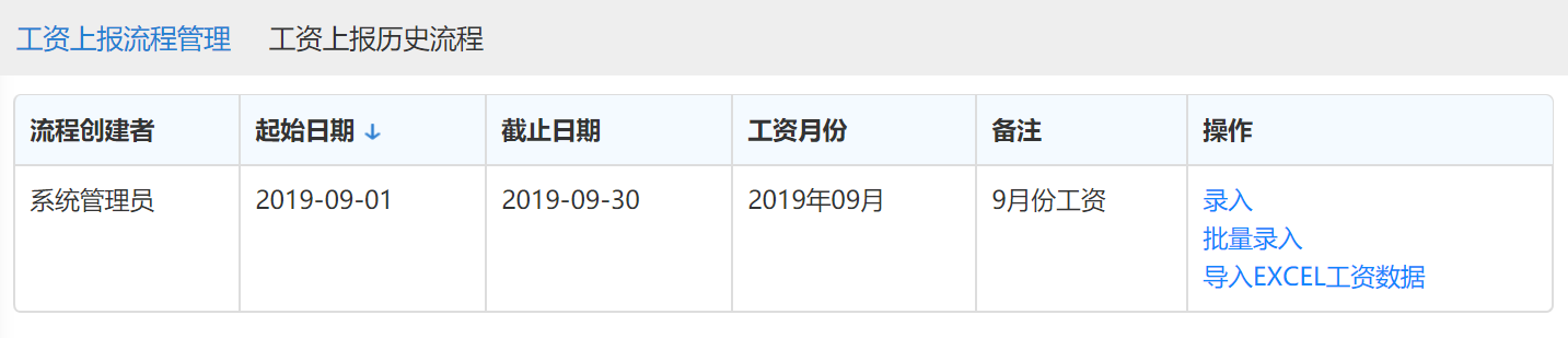 进入财务工资录入界面后,界面直接显示待办的工资流程列表,财务人员可点击操作下的【录入】进行部门或者单个员工的工资录入;用户也可以选择EXCEL导入。财务工资录入界面。