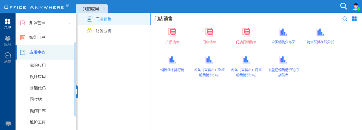 通达Office Anywhere 11.0版安装好之后,以”admin”身份登陆系统,可以看到应用中心操作菜单,如下图所示: