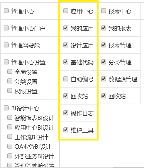 如果看不到上述菜单,请依次访问 系统管理->组织机构设置 -> 角色与权限管理 ,把应用中心相关菜单勾选上,如下图: