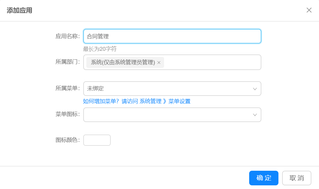 注:这个所属部门只有管理员有权设置。所属菜单: 指应用所绑定的菜单。通过应用中心创建的应用,如果是通过独立菜单来访问的,那么应用需要绑定一个菜单。所属菜单可以空着,等后期系统建成以后通过自动绑定菜单由系统自动赋值。