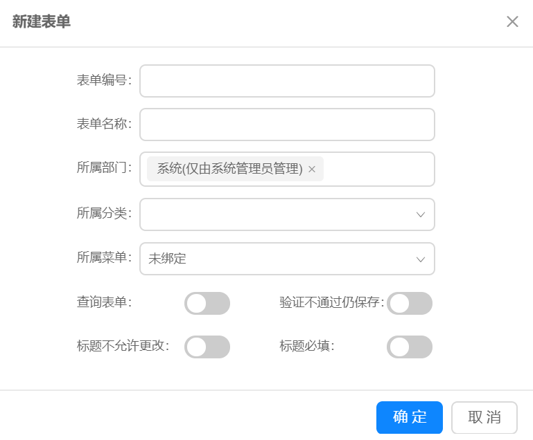 注:一个表单只能绑定一个菜单。查询表单: 代表该表单为查询类表单,只能查询、查看,不能存储结果。