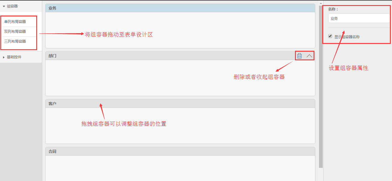 小提示:不同组容器之间是有间隔的,如果希望组容器与之前的容器紧贴在一起而不留间隔,只需把该组容器的”显示组容器名称”选项去除即可。根据2.2.1节需求描述,基础设置表单需要体现四组信息,分别是业务类型、创收部门、客户类型以及合同分期,因此我们拖拽四个单列布局容器到表单区域中,并把它们依次命名为”业务”、”部门”、”客户”、”合同”,如下图: