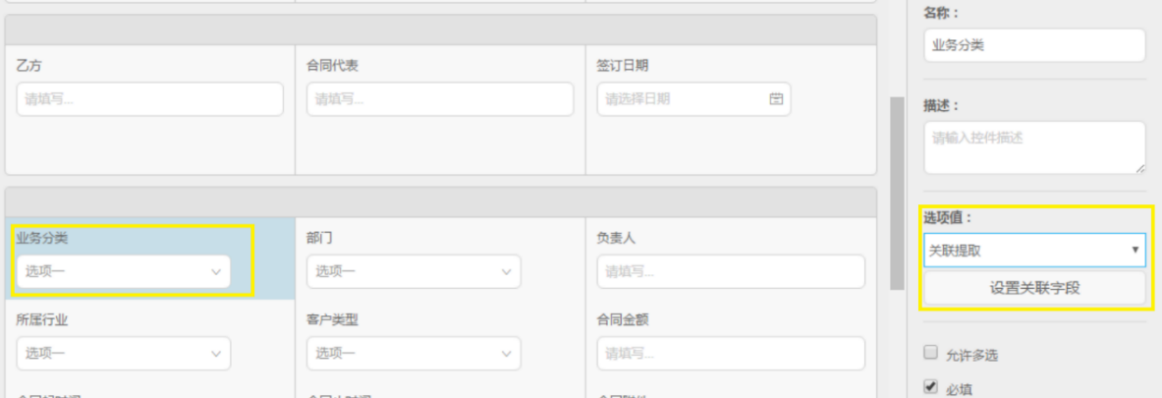 部门下拉选择控件的选项值类型定义为 关联提取,设置关联字段如下图:
