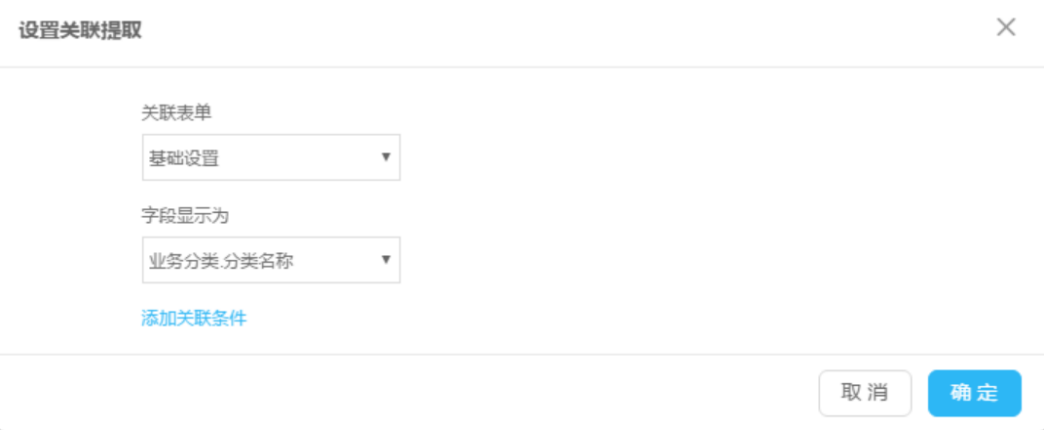 其中,部门为下拉选择、起始时间和结束时间为日期文本,分析结果为列表,分析结果包含应收款周期单行文本、应收金额货币文本两个子字段,部门选项值类型为关联提取,设置关联字段如下图: