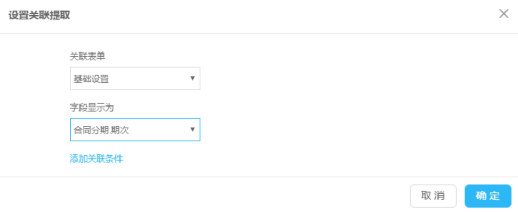 | 合同期次 | 提取 | 收款登记 | 条件触发 | 数据范围:全部 数据来源:签订合同、签订合同.收款进度 数据关联:无 数据过滤:本表单.合同编号=签订合同.合同编号 && 签订合同.收款进度.坏账标识 ISNULL && 签订合同.收款进度.已收款标识 ISNULL 数据填充:选择表单为 合同收款;收款期次的填充方式指定为 构造下拉列表,填充表达式为 签订合同.收款进度.进度款分期 数据排序:无 |