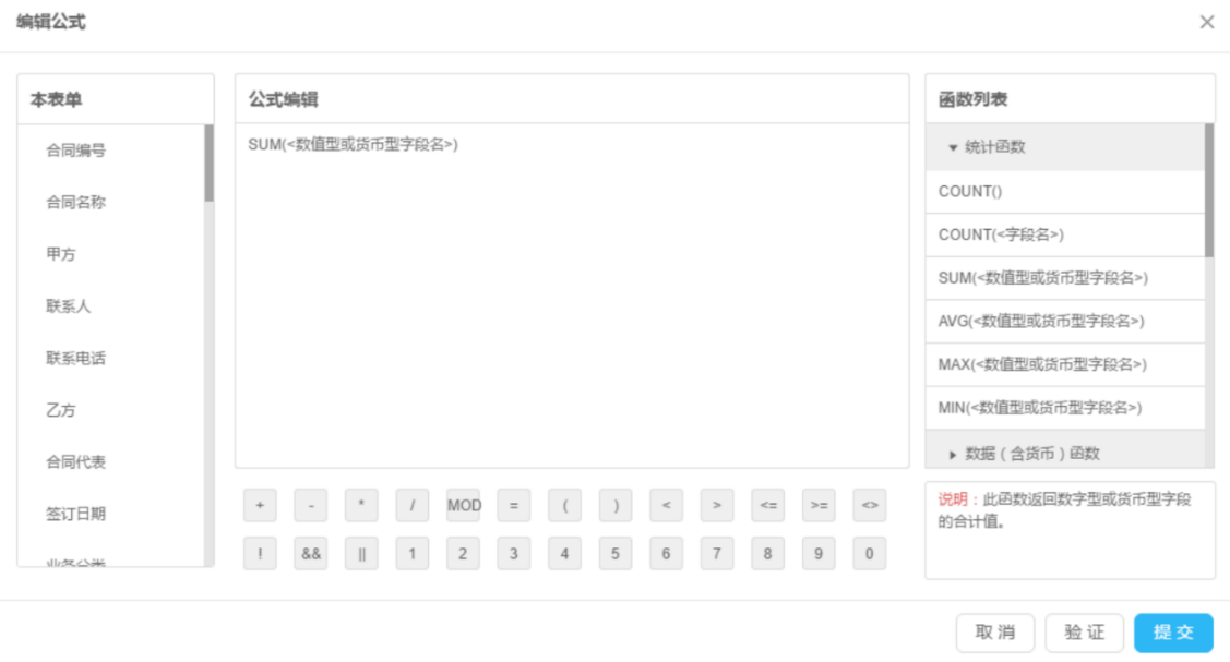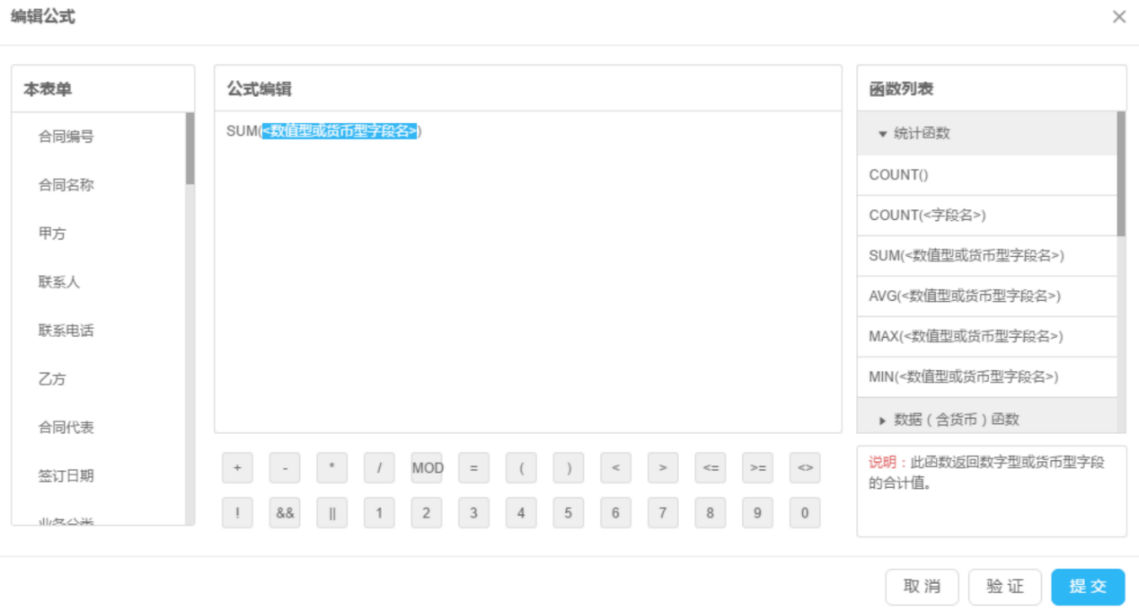 合同总金额货币文本的默认值类型设置为 表达式,表达式设置为: