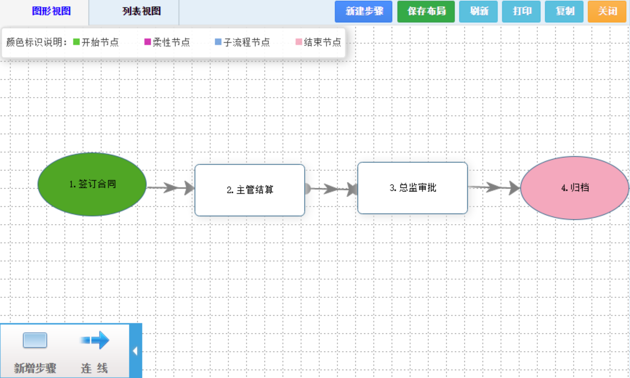 签订合同 -> 主管审核 -> 总监审批 -> 归档。