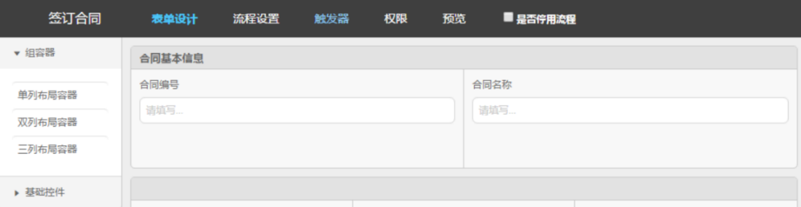签订合同表单可以划分为四大部分,分别是基本信息、收款进度管理、进款结算管理以及合同审批。基本信息部分用两个容器,一个容器为两列组容器,名称为基本信息;另一个容器为三列组容器,并取消勾选”显示组容器名称”选项,如下图: