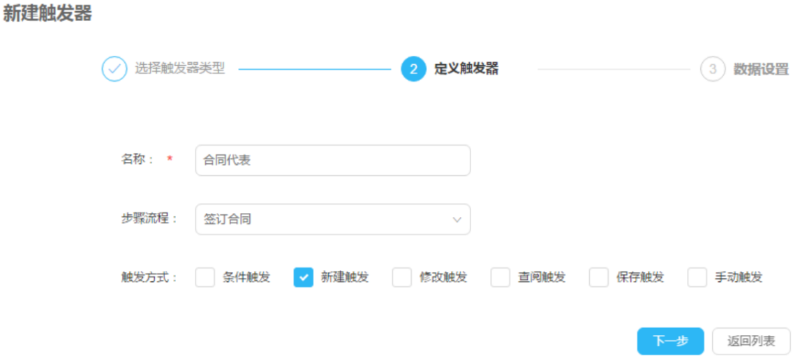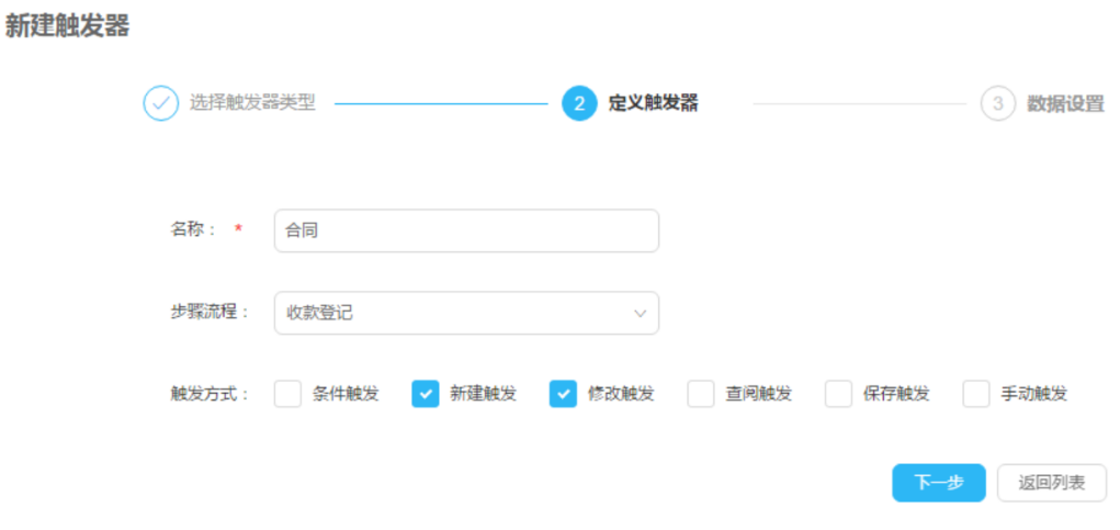 | 名称 | 触发器类型 | 流程步骤 | 触发方式 | 触发设置 | |||||||||