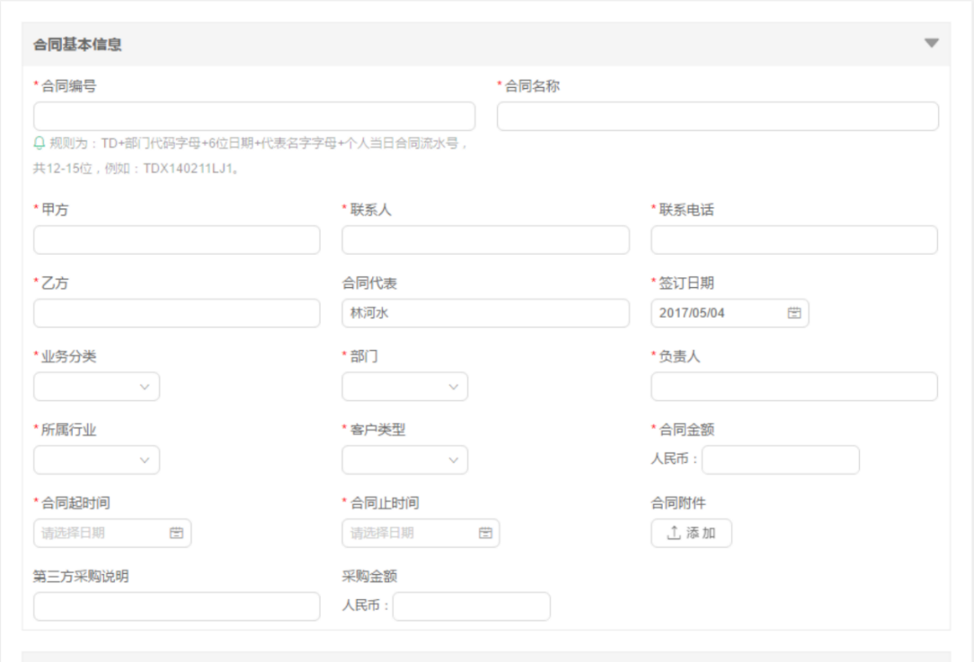 | 单行文本 | 合同编号 | 规则为:TD+部门代码字母+6位日期+代表名字字母+个人当日合同流水号,共12-15位,例如:TDX140211LJ1。 | 长度为15 必填 不重复 |