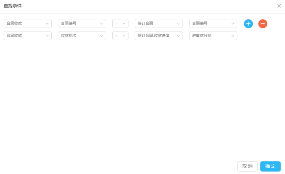 点击”查找条件”,定义查找条件为”合同收款.合同编号=签订合同.合同编号 以及 合同收款.收款期次=签订合同.收款进度.进度款分期”,如下图: