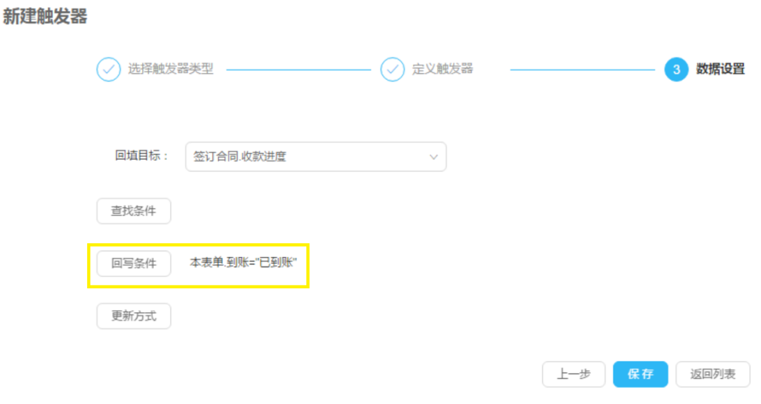 点击”确定”后返回,接着点击”回写条件”,定义回写条件为 本表单.到账=“已到账”,如下图: