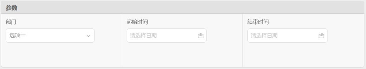 合同汇总表单由参数和汇总结果两部分组成。参数部分包括部门、起始时间和结束时间,部门采用下拉选择控件,起始时间和结束时间用日期控件,绘制结果如下图: