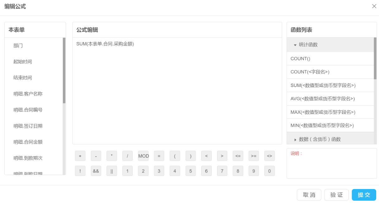 采购总金额货币文本的默认值设置为 表达式,表达式设置为: