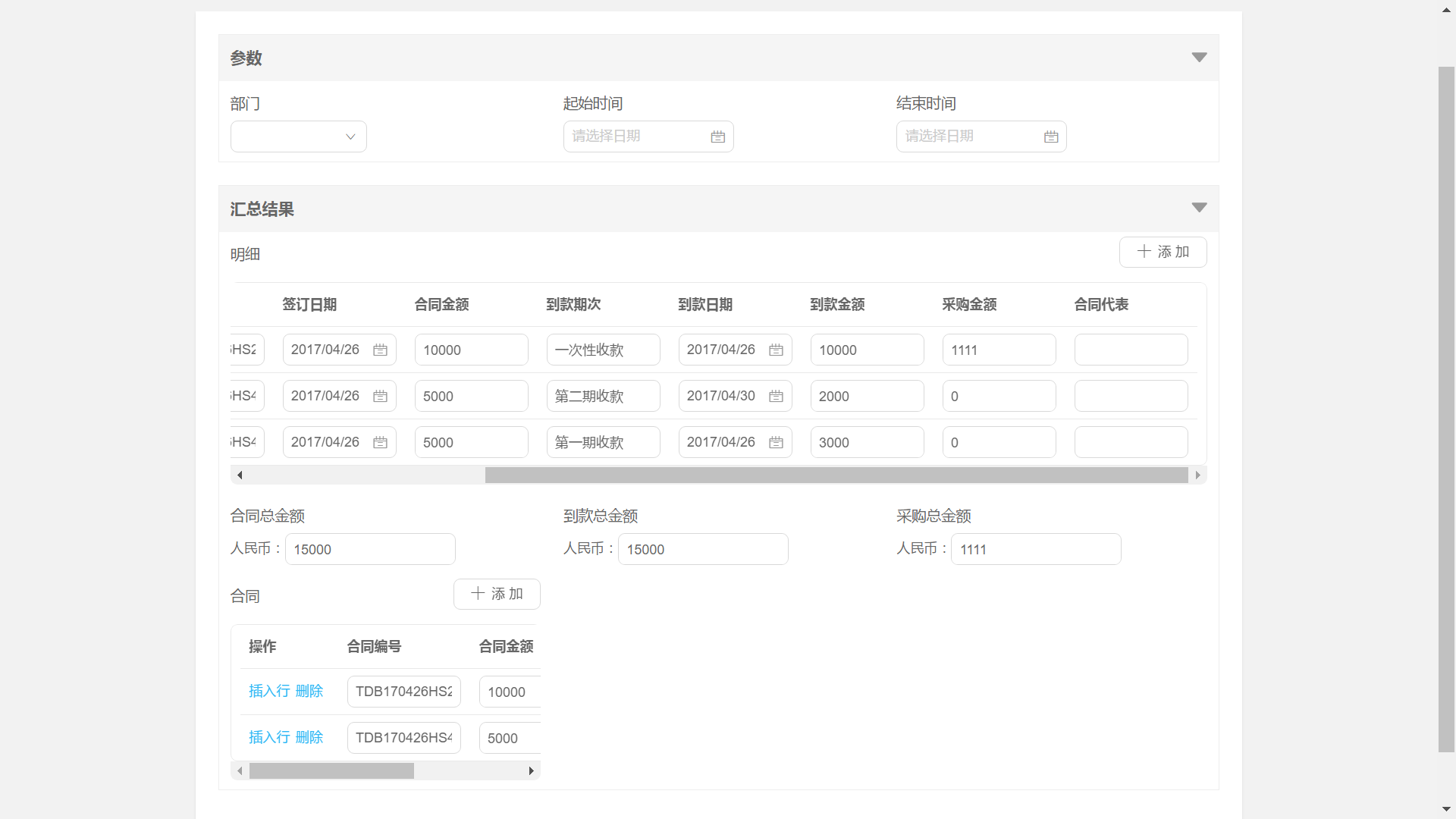 合同汇总可以根据部门、起始时间、结束时间三个参数汇总合同以及收款信息。