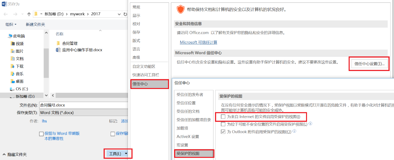保存word模板时,把 工具 -> 保存选项 -> 信任中心 -> 信任中心设置 ->受保护视图中”为来自internet的文件启用受保护的视图”选项取消勾选,如下图所示: