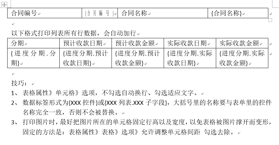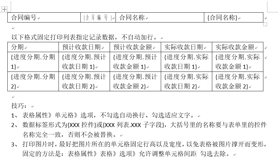 列表数据支持两种打印形式,一种是固定行打印,数据标签列表第一条记录为{收款进度.分期1}、{收款进度.预计收款日期1}、{收款进度.预计收款金额1},第二条记录为{收款进度.分期2}、{收款进度.预计收款日期2}、{收款进度.预计收款金额2},分别代表打印第一条和第二条记录数据,其他记录类推;另一种是动态行打印,即打印之前需要给表格插入足够多行以打印列表里所有数据,数据标签用{收款进度.分期}、{收款进度.预计收款日期}、{收款进度.预计收款金额}来标识。