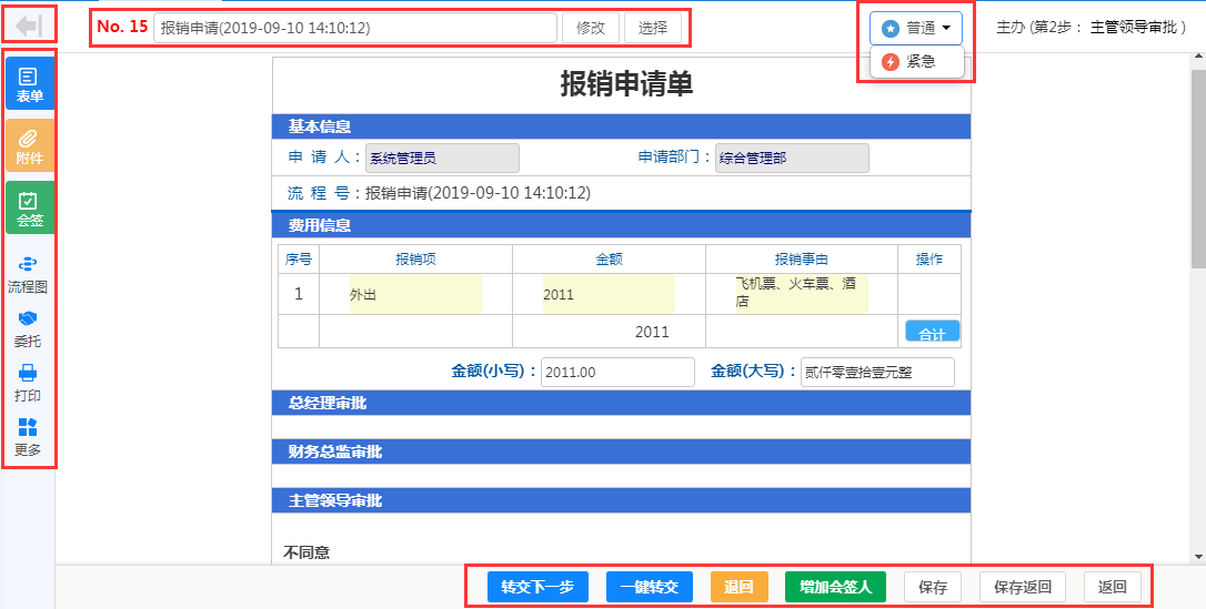 进入工作办理界面,可以根据工作的优先级选定此工作是普通还是紧急。这样便于用户在办理工作时区分哪些工作需要紧急处理。
