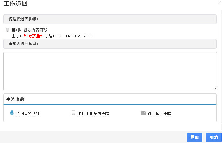 退回: 退回时可以选择不同的事务提醒,如下图所示: