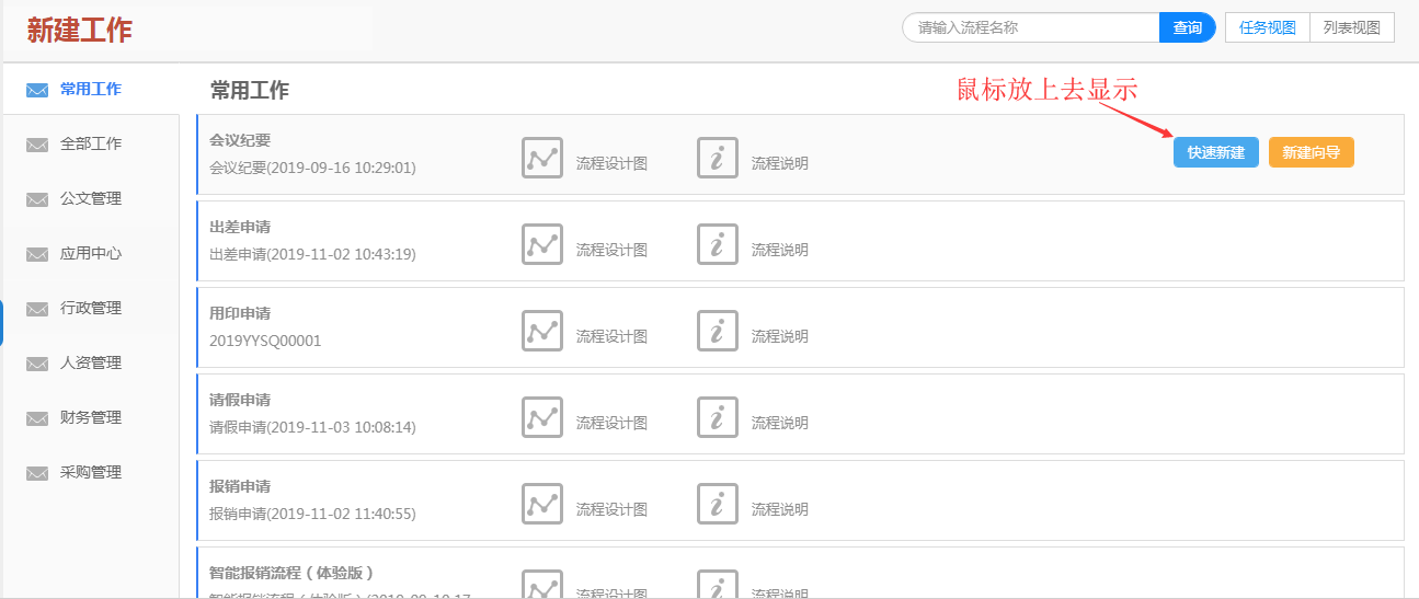 在常用流程中心程中新建工作时可以选择新建向导或快速新建。