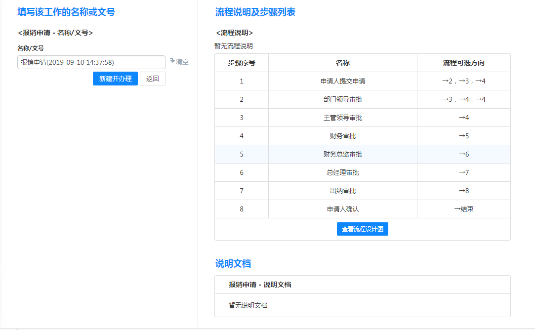 点击【新建向导】按钮,可以在有文号修改权限的情况下输入或修改文号,或在文号前后强制添加前缀或后缀。其需要在在流程中心->工作流设置->设计流程->定义流程属性->工作流名称/文号中,设置是否允许修改文号;每步骤是否允许修改,需要在可写字段中进行设置。在新建向导界面,您可以阅读流程说明、查看流程设计图、查看工作表单模版,从而对整个流程中心程有大致的了解。