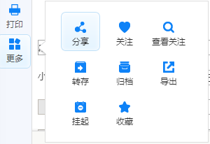 在流程中心的办理界面(不管是主办还是会签),有一个更多操作选项,此选项包含了九个功能:分享(微讯、公告通知、电子邮件)、关注、查看关注、转存、归档、导出、挂起、收藏以及父表单。如图: