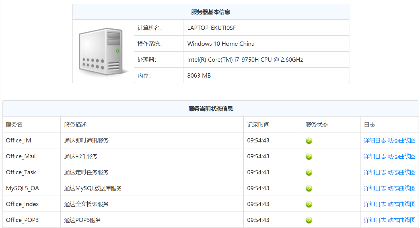 服务器状况信息,可以通过自动守护程序从每个服务器获取,管理员能看到每个服务器对应服务的状况,从而对整个OA系统的运行全面掌控。服务器运行状况。