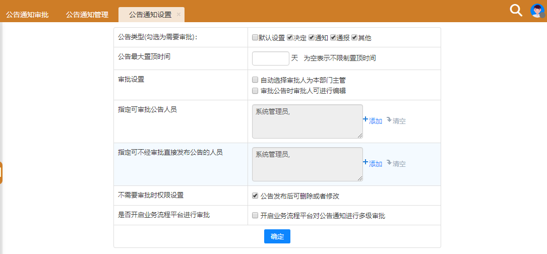 公告通知需要审批的由发布人和审批人共同管理,不需要审批的由发布人管理。