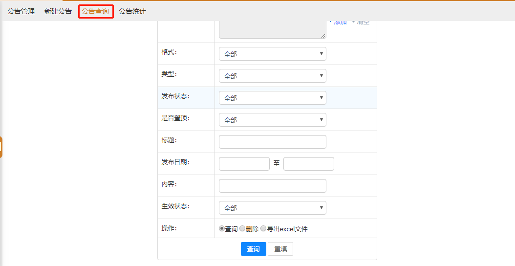 公告通知的查询功能,能实现对公告通知的查询或删除。