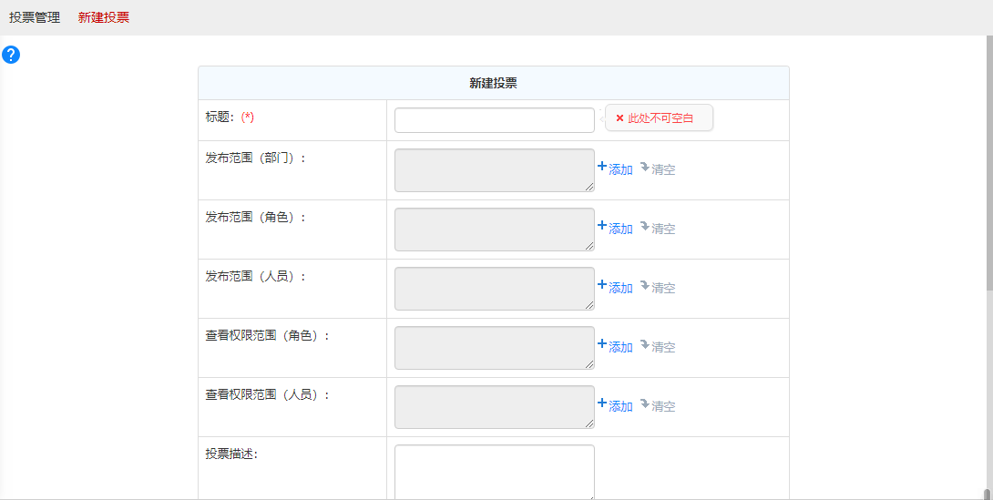 点击“新建投票”按钮,建立一个新的投票项目,选择发布范围,投票的类型,查看投票结果的方式,设置投票的有效期和置顶时间等。