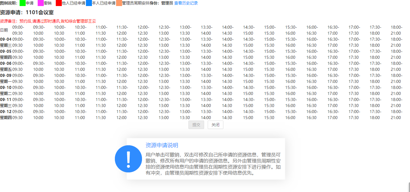 用户需要申请某个资源时,点击该资源名称,进入申请界面,按照时间进行点选,并点击提交。提交后,管理员可以将他人申请的时间段撤销。
