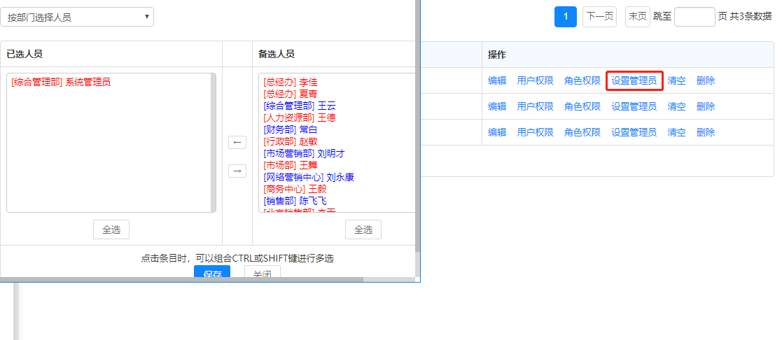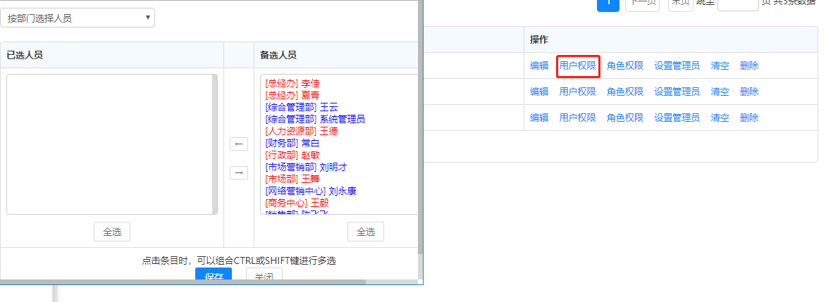用户可以根据单位的情况添加资源,并对资源的申请做一些设置,比如针对该资源设定用户权限和角色权限,并且对该资源管理设置一个或者多个管理员。在设定用户权限时,有可能会遇到用户比较多不太容易查找的情况,此时可以按搜索人名选择人员,避免了一个一个查找的麻烦。