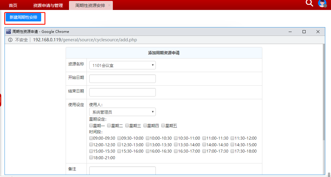 资源的申请还可以进行周期性申请,即对某一个时间段内需要重复用到该资源的,可以在此进行周期性申请。申请时,只需要设定申请的开始和结束日期,并设定每星期在哪几天、哪些时间段使用该资源,选择后点击“保存”即可。