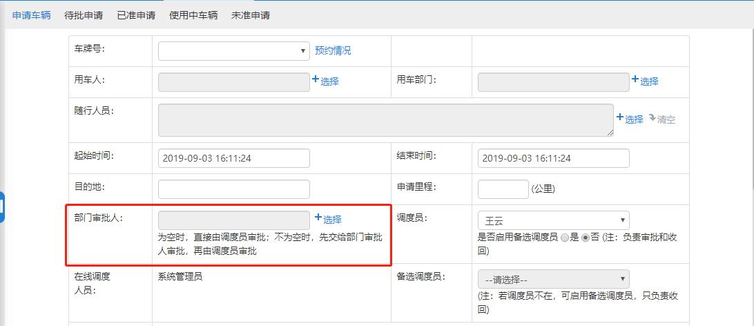 部门审批管理是对申请车辆时,需要提交的部门审批人操作的模块,该模块与调度员一样,属于审批功能。如果部门审批不能通过,则审批算作不通过,申请进入“未准申请”。当部门审批人为空时,则交由调度员审批。